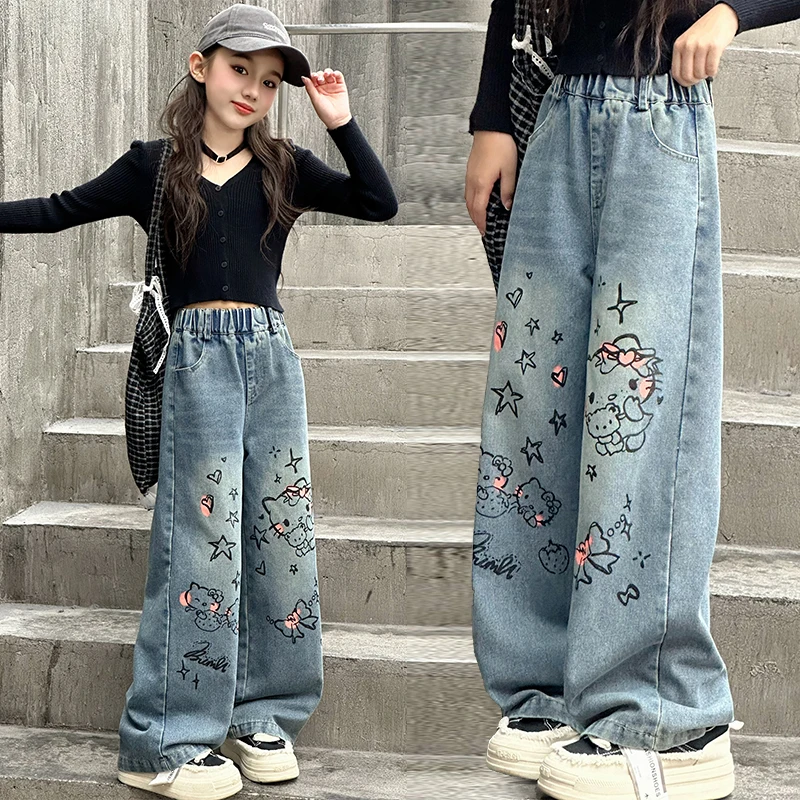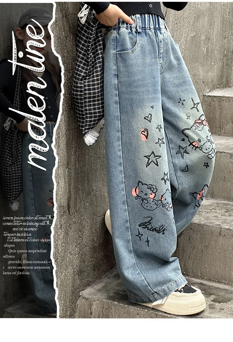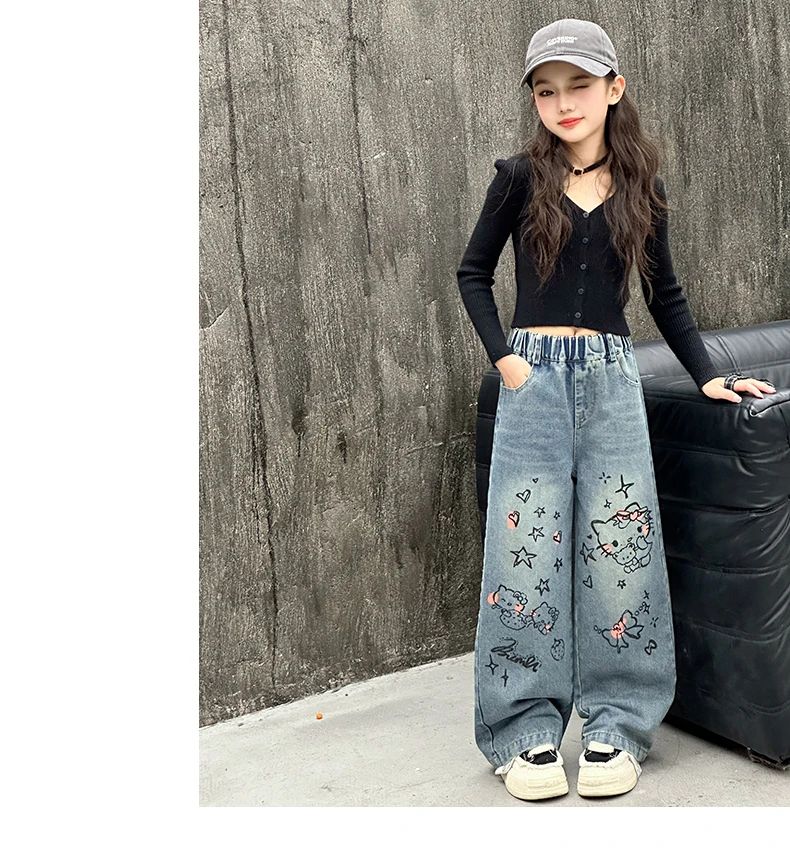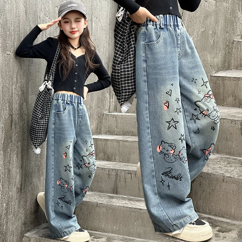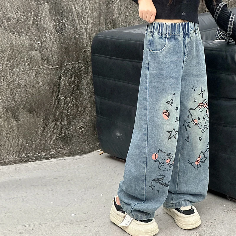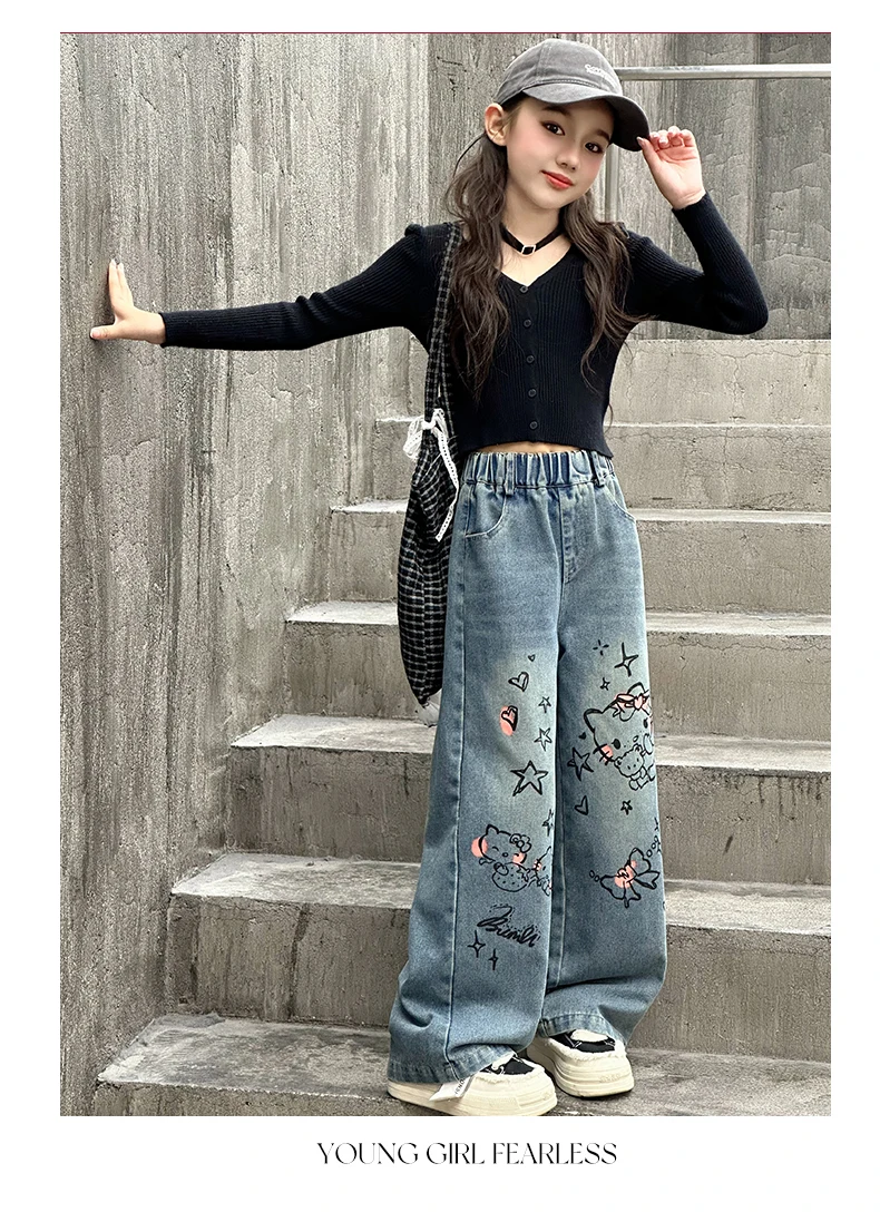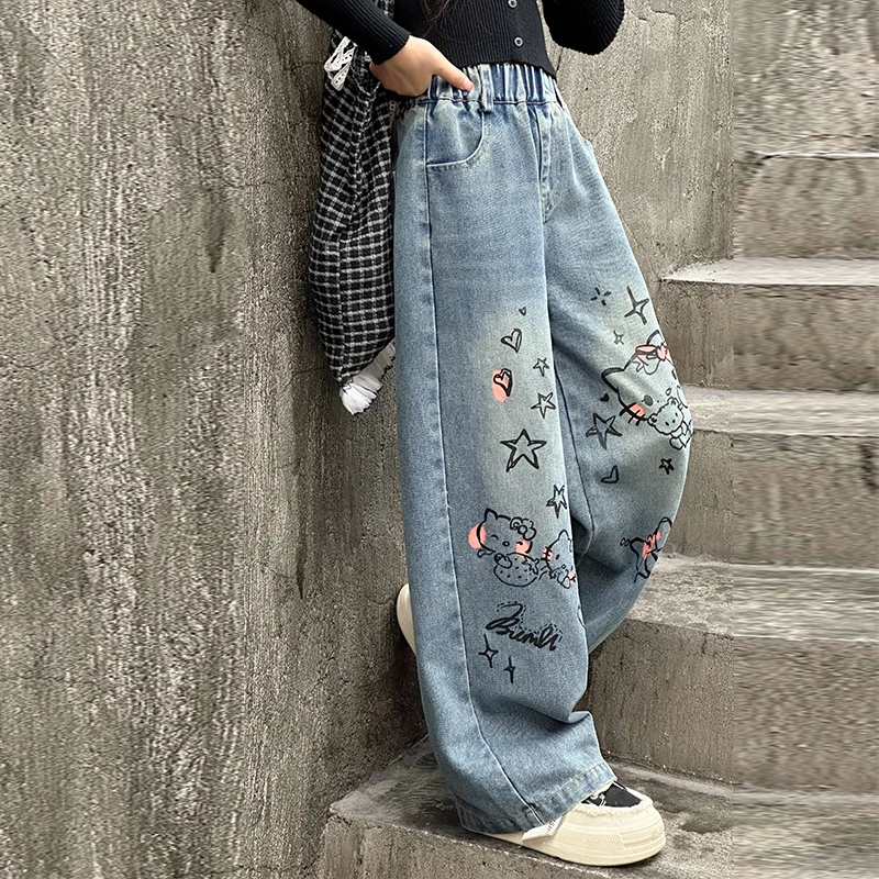 الخريف الفتيات الصغيرات الكرتون واسعة الساق الجينز في سن المراهقة الاطفال منشفة مطرزة القط الدنيم السراويل موضة بناطيل أطفال 4 6 8 10 12 14