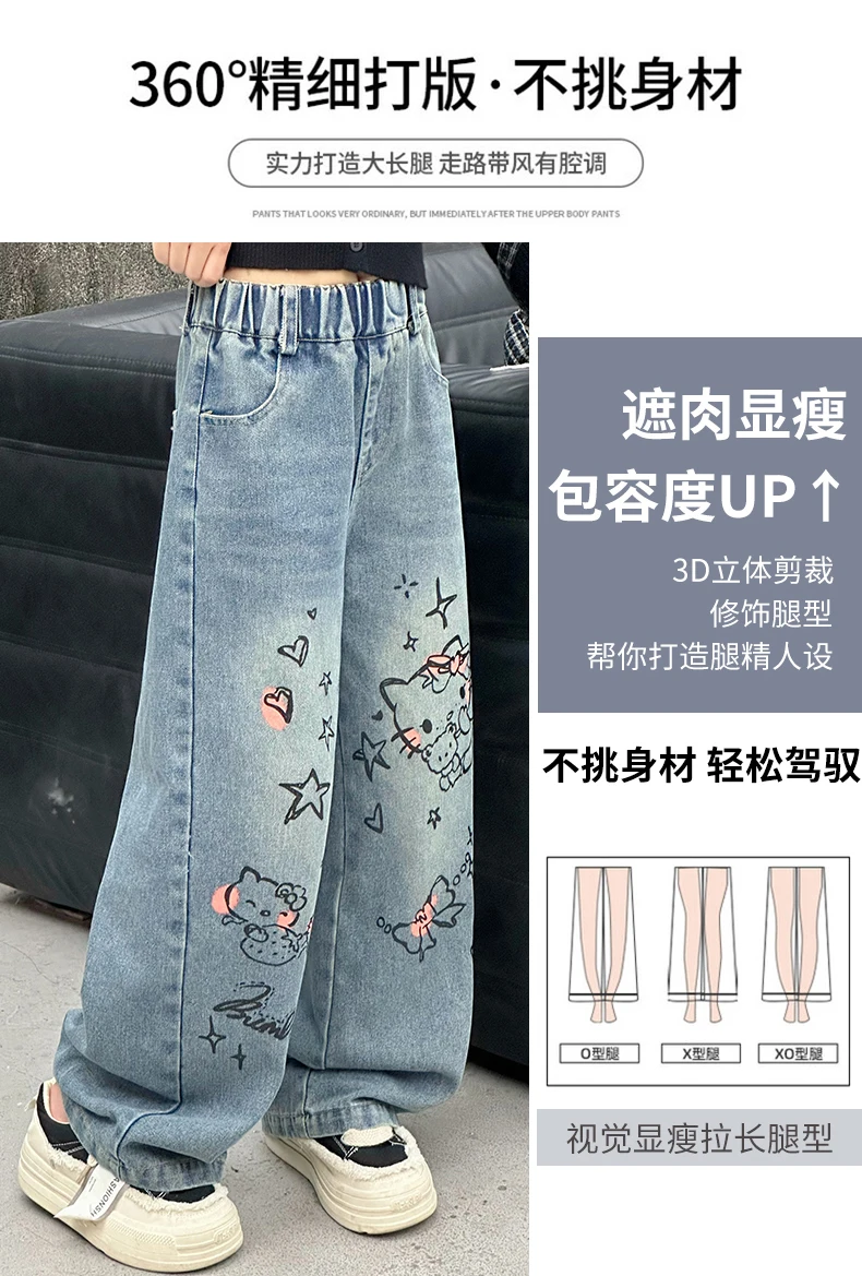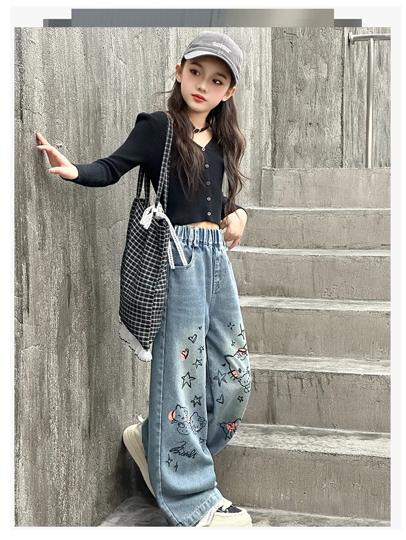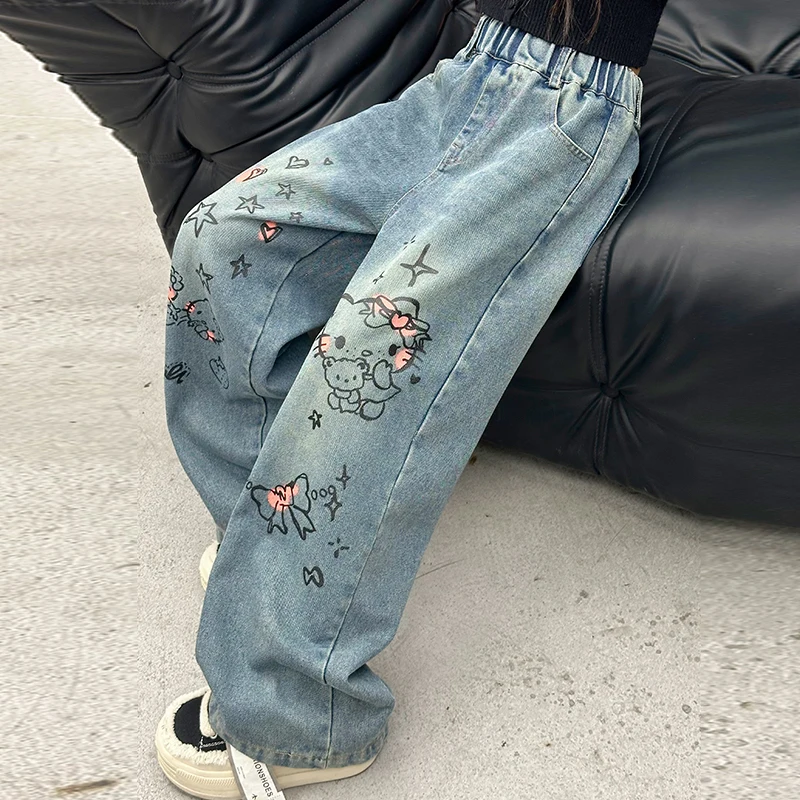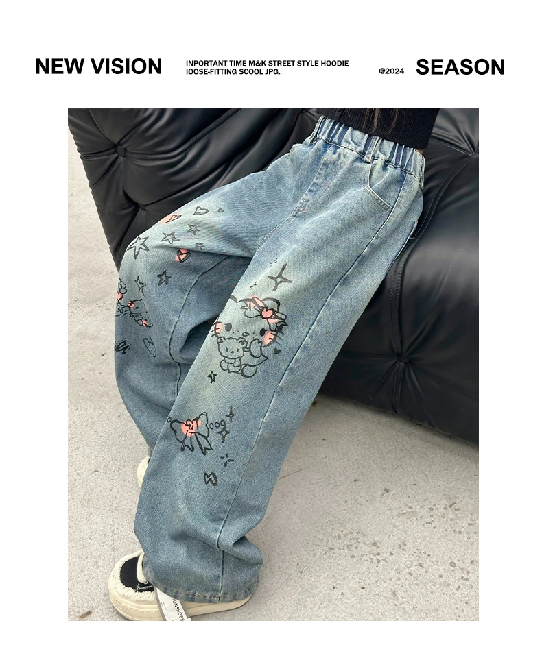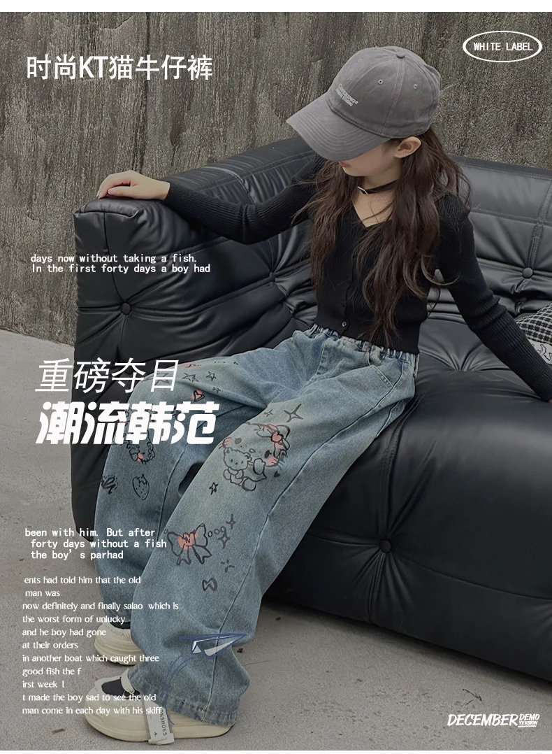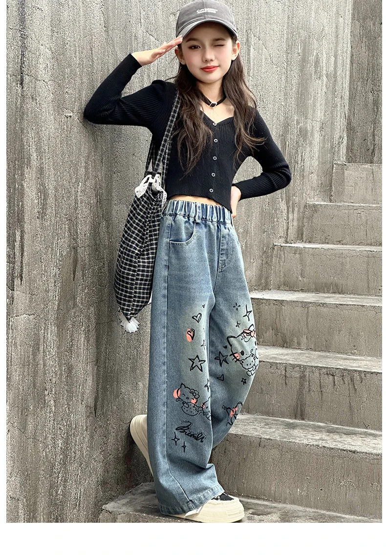 الخريف الفتيات الصغيرات الكرتون واسعة الساق الجينز في سن المراهقة الاطفال منشفة مطرزة القط الدنيم السراويل موضة بناطيل أطفال 4 6 8 10 12 14