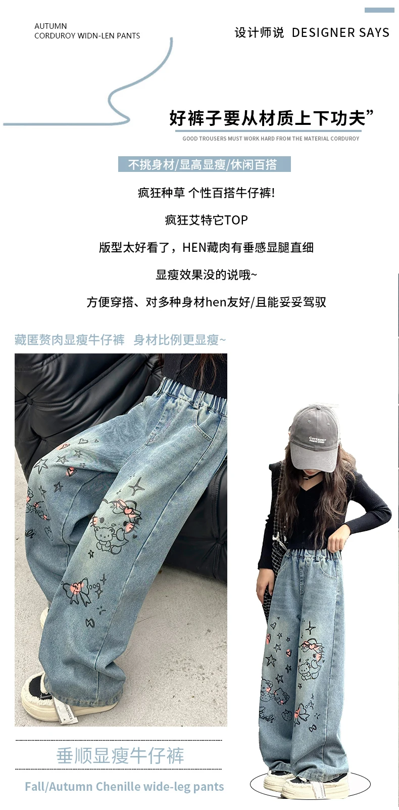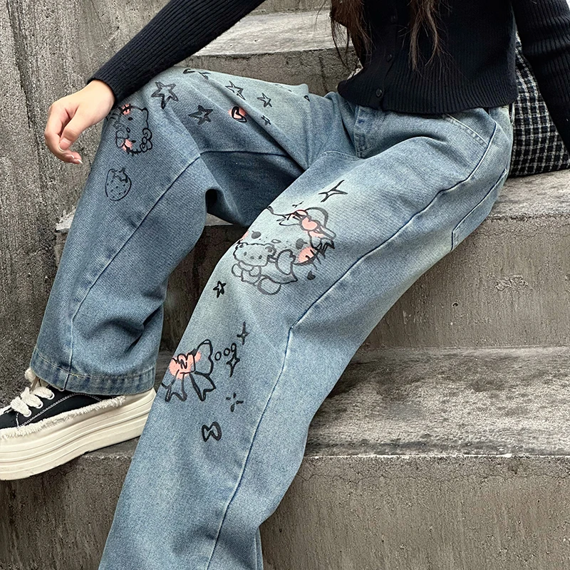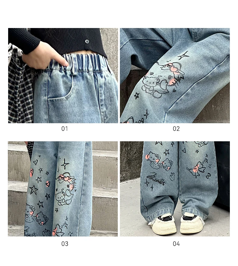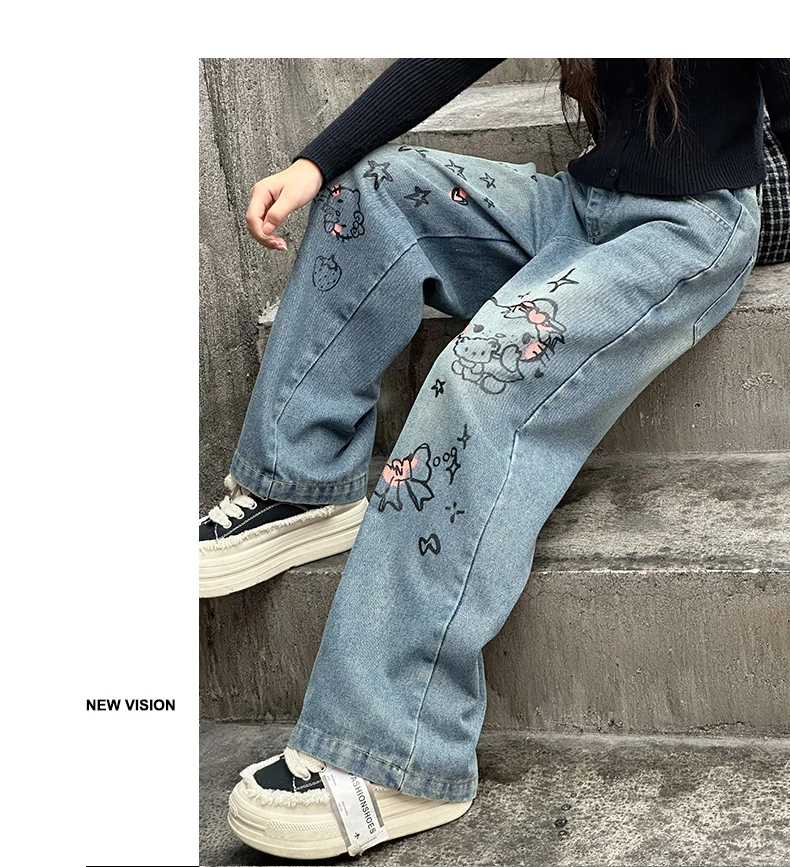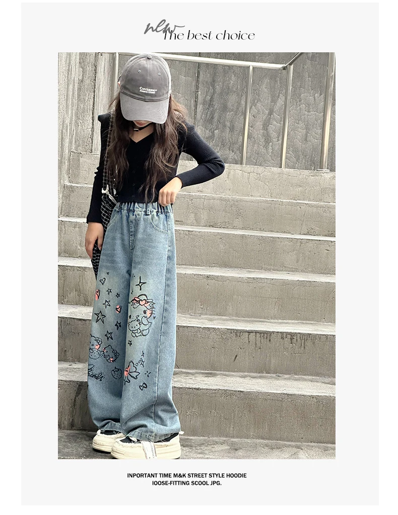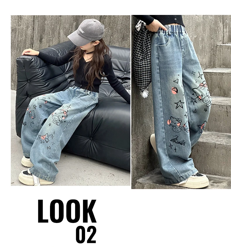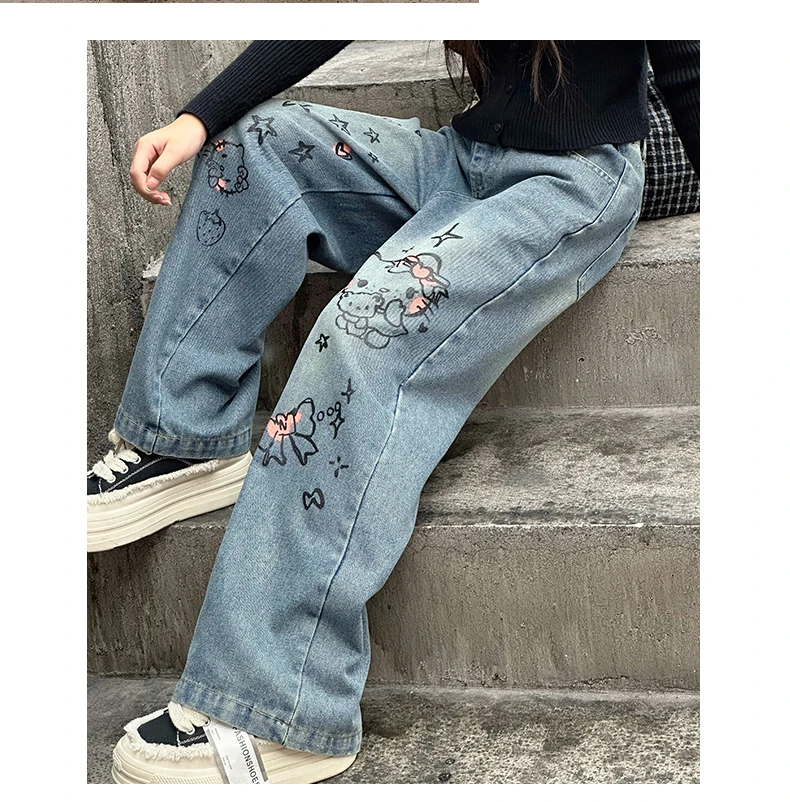 الخريف الفتيات الصغيرات الكرتون واسعة الساق الجينز في سن المراهقة الاطفال منشفة مطرزة القط الدنيم السراويل موضة بناطيل أطفال 4 6 8 10 12 14