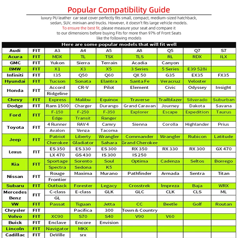 • يناسب 95% من المركبات:تم تصميم أغطية المقاعد هذه لتناسب 95% من المركبات، مما يجعلها خيارًا متعدد الاستخدامات لأصحاب السيارات.