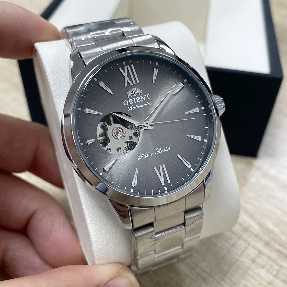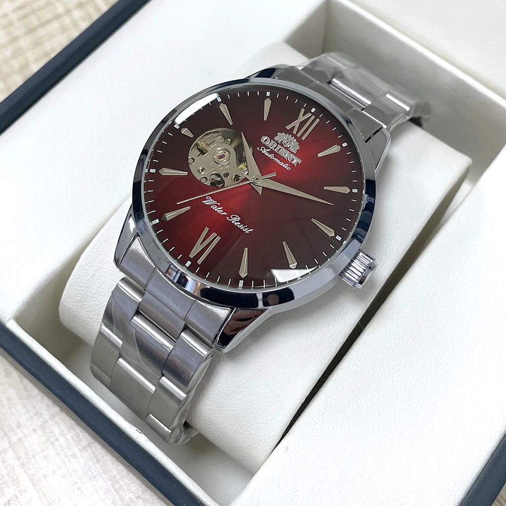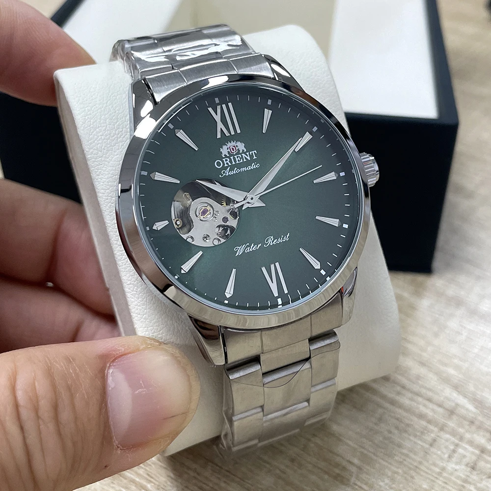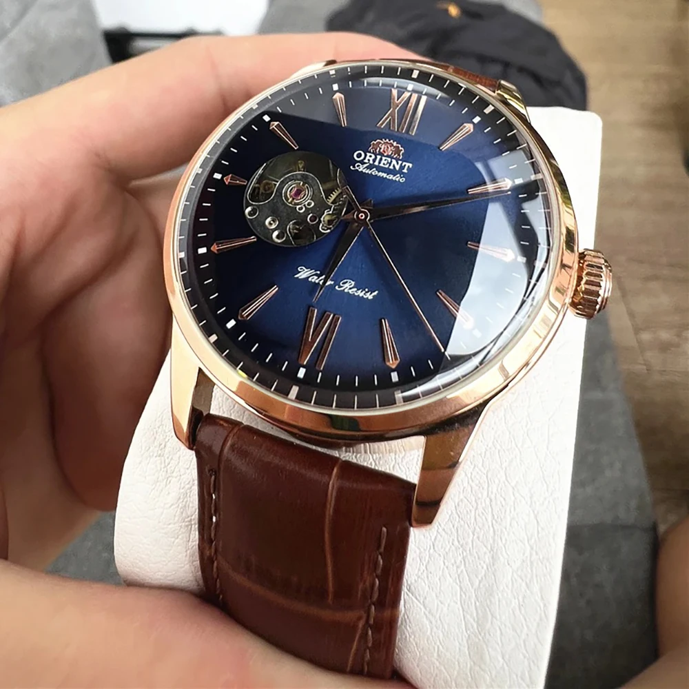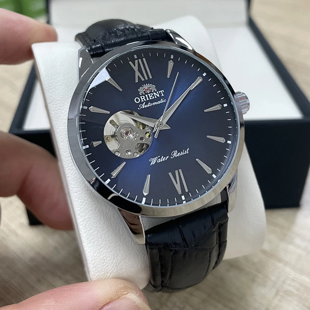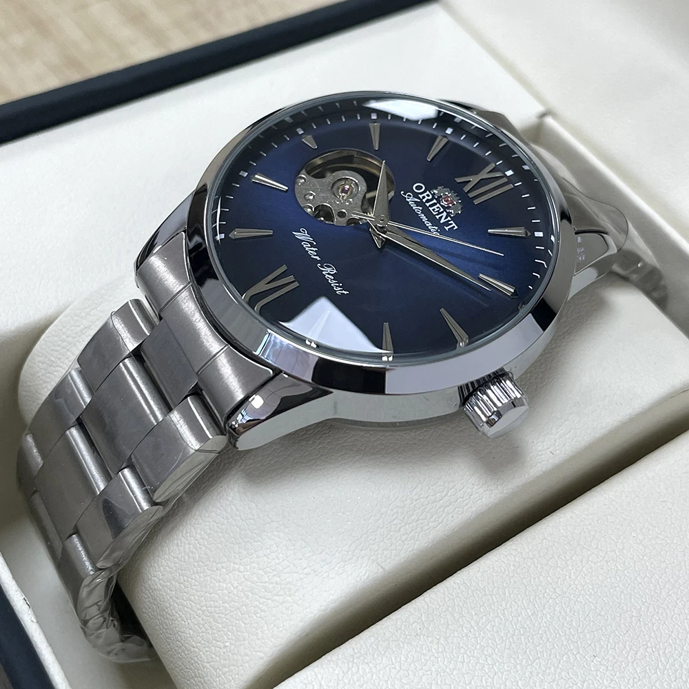 ساعة أورينت للرجال أوتوماتيكية مفتوحة القلب بمينا أزرق وسوار من الفولاذ المقاوم للصدأ كاجوال فستان ساعة يد 30 متر مقاومة للماء