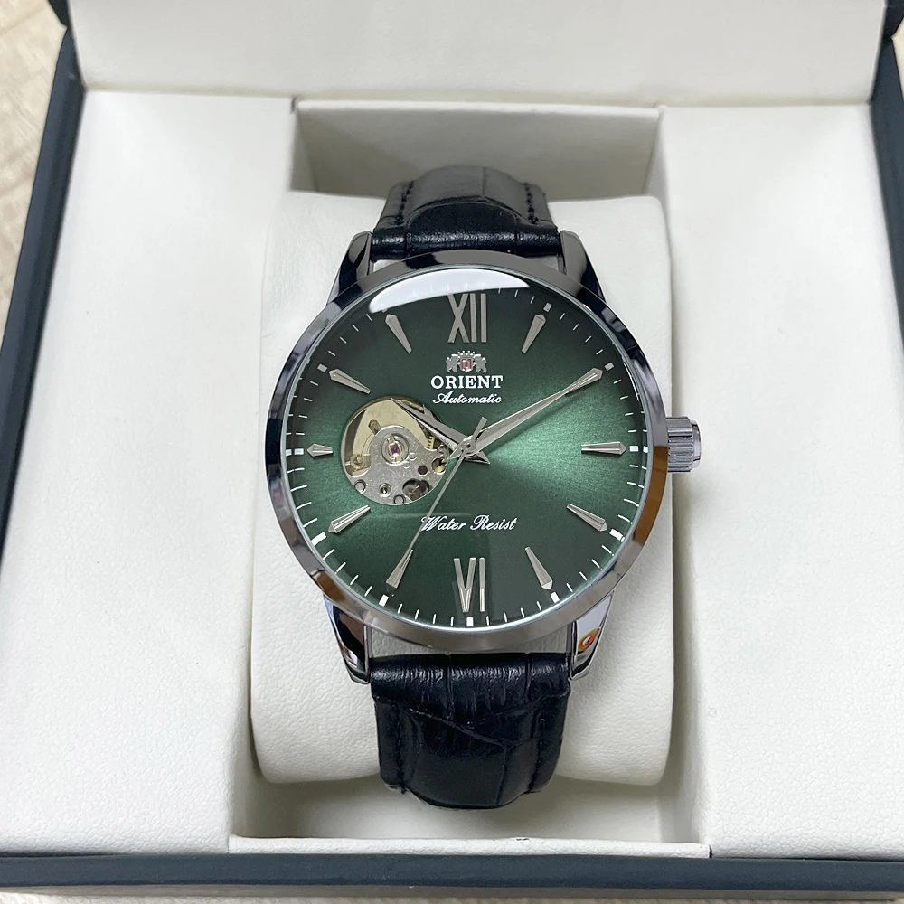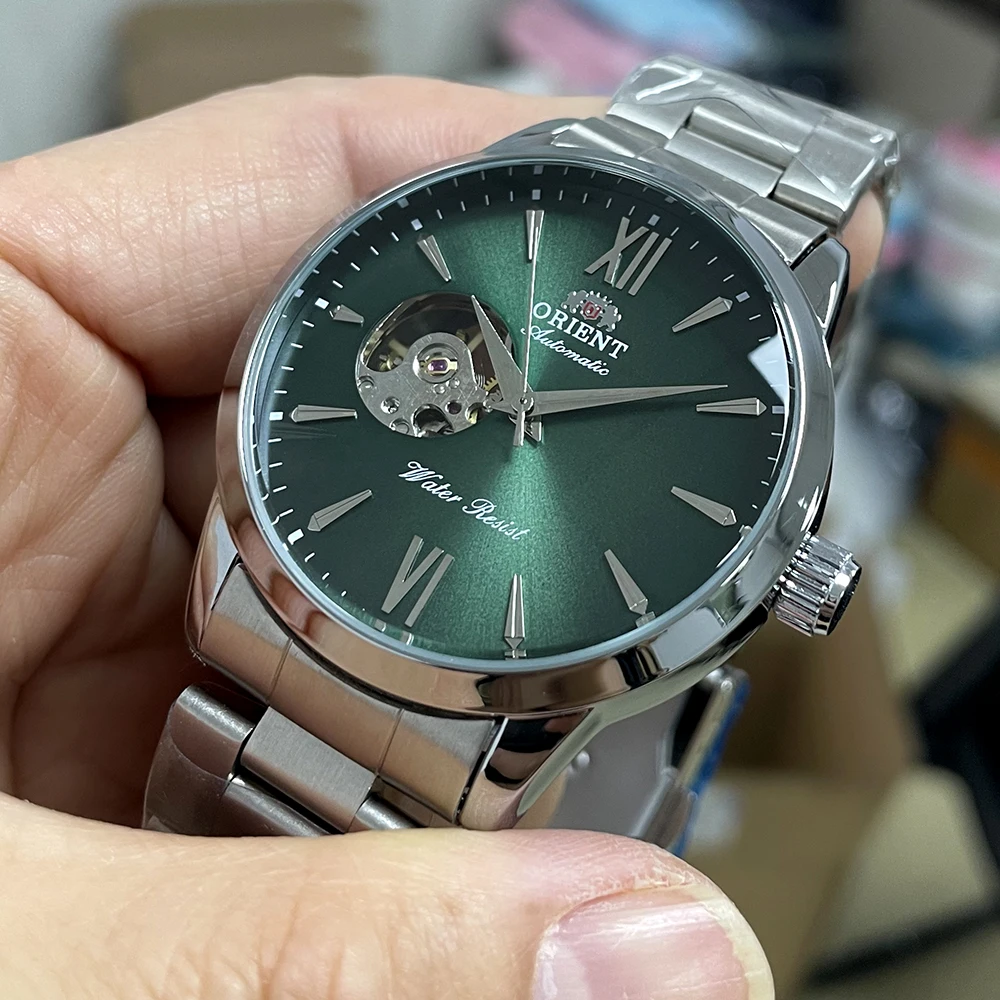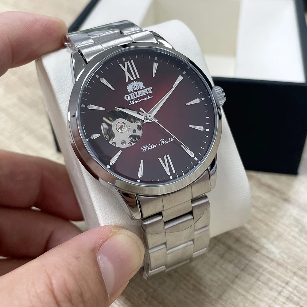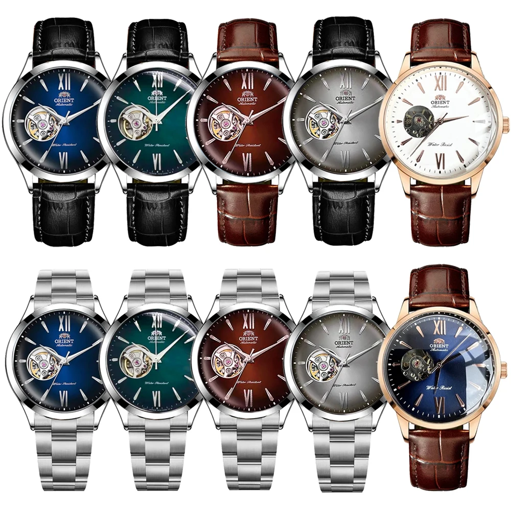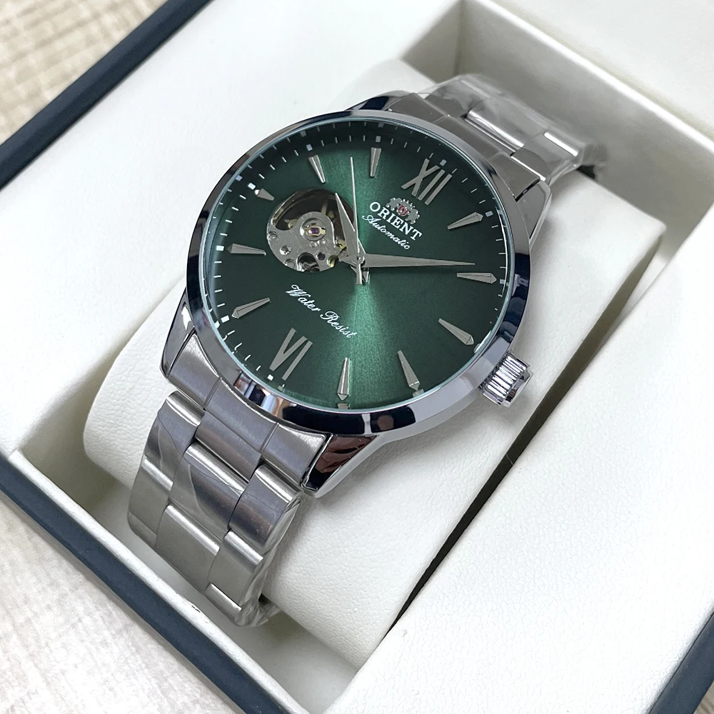 ساعة أورينت للرجال أوتوماتيكية مفتوحة القلب بمينا أزرق وسوار من الفولاذ المقاوم للصدأ كاجوال فستان ساعة يد 30 متر مقاومة للماء